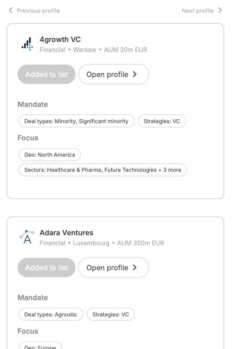 Save best-fit investors to your list, access contacts and LinkedIns and kick off your deal effortlessly!